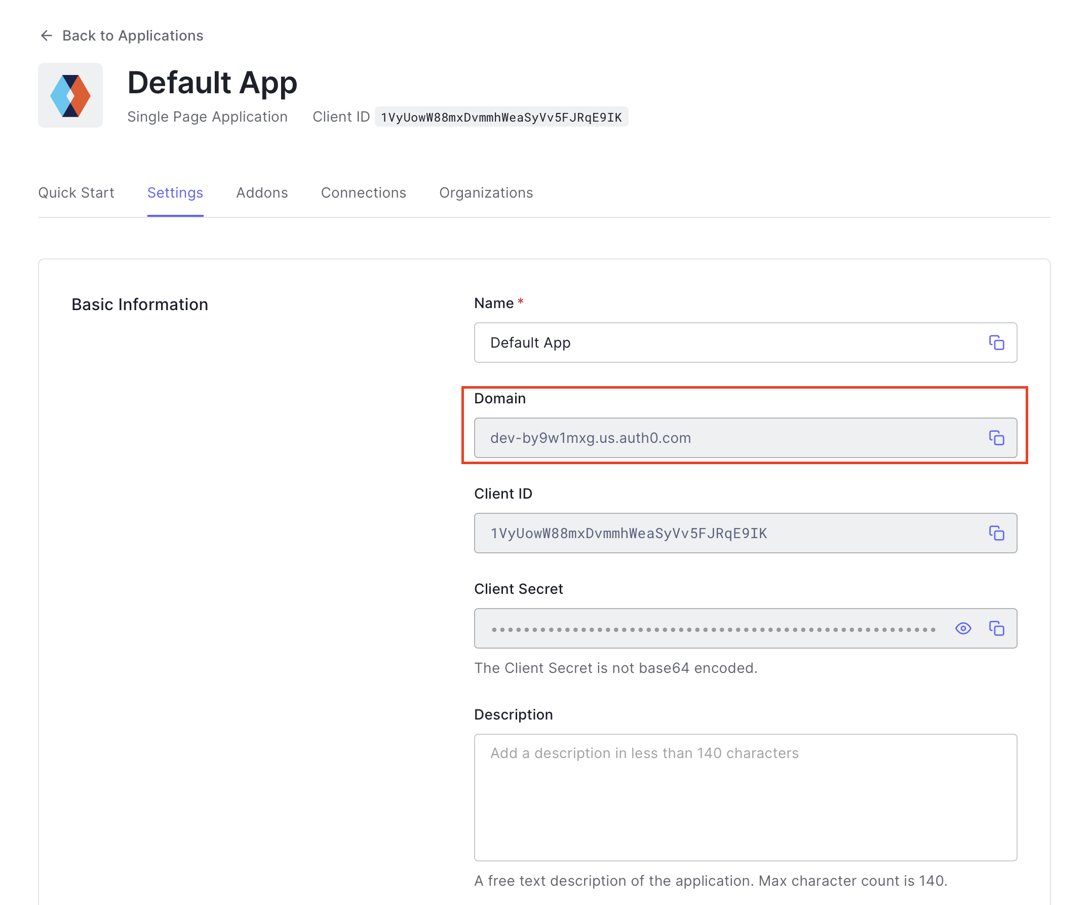 On your Auth0 management page, go to Applications. Create or edit an application and fill in the appropriate values for your project. The important item to copy from this page is your Auth0 domain. This domain might be your Auth0 account ID, unless you have set up a custom domain.